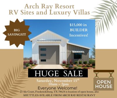 Visit Arch Ray Resort on Saturday, November 15th, 2025 we will have 23 Ale Court, Fredericksburg, TX open to showcase the type of villa that can be built at Arch Ray on the River Community.